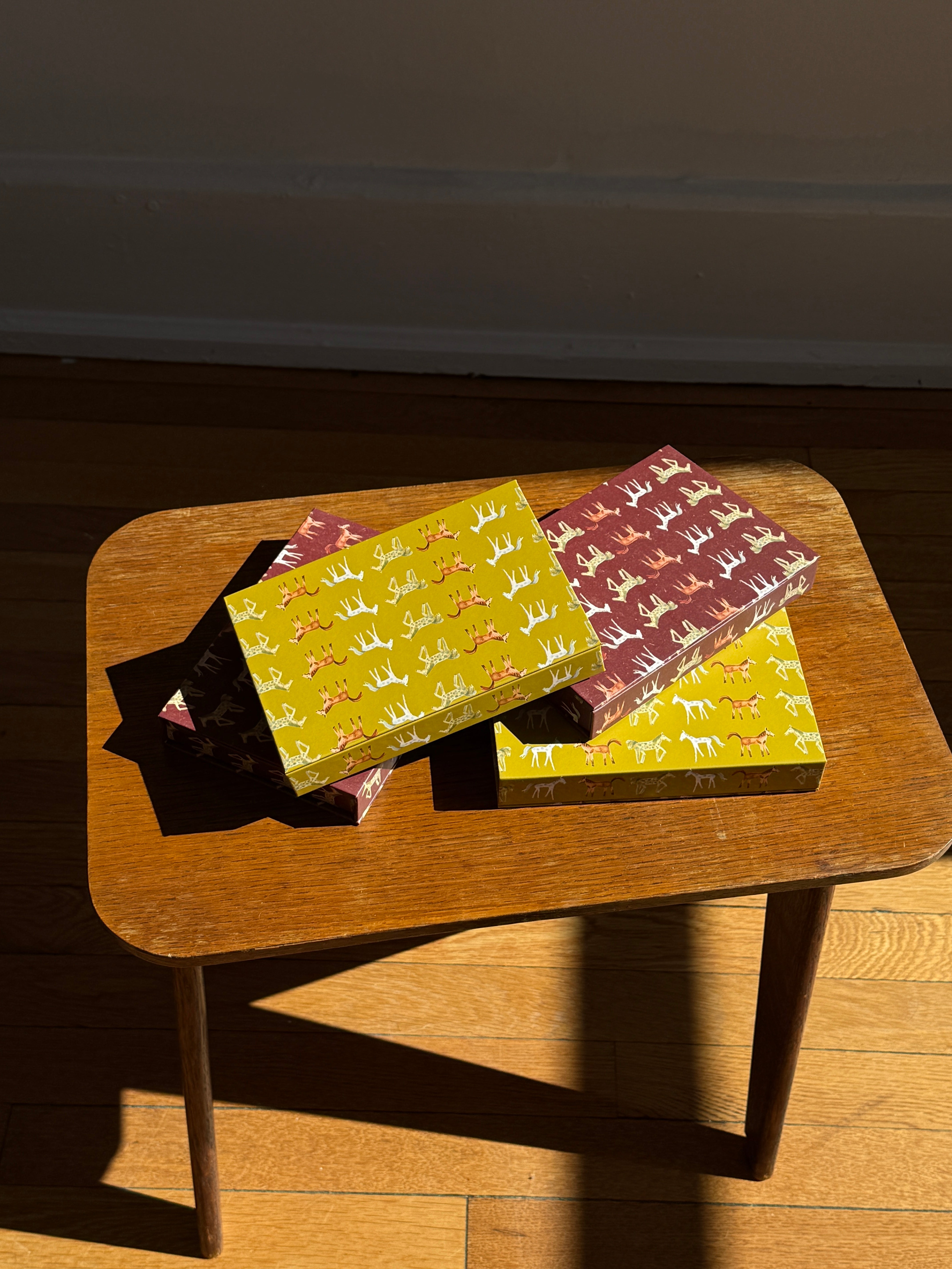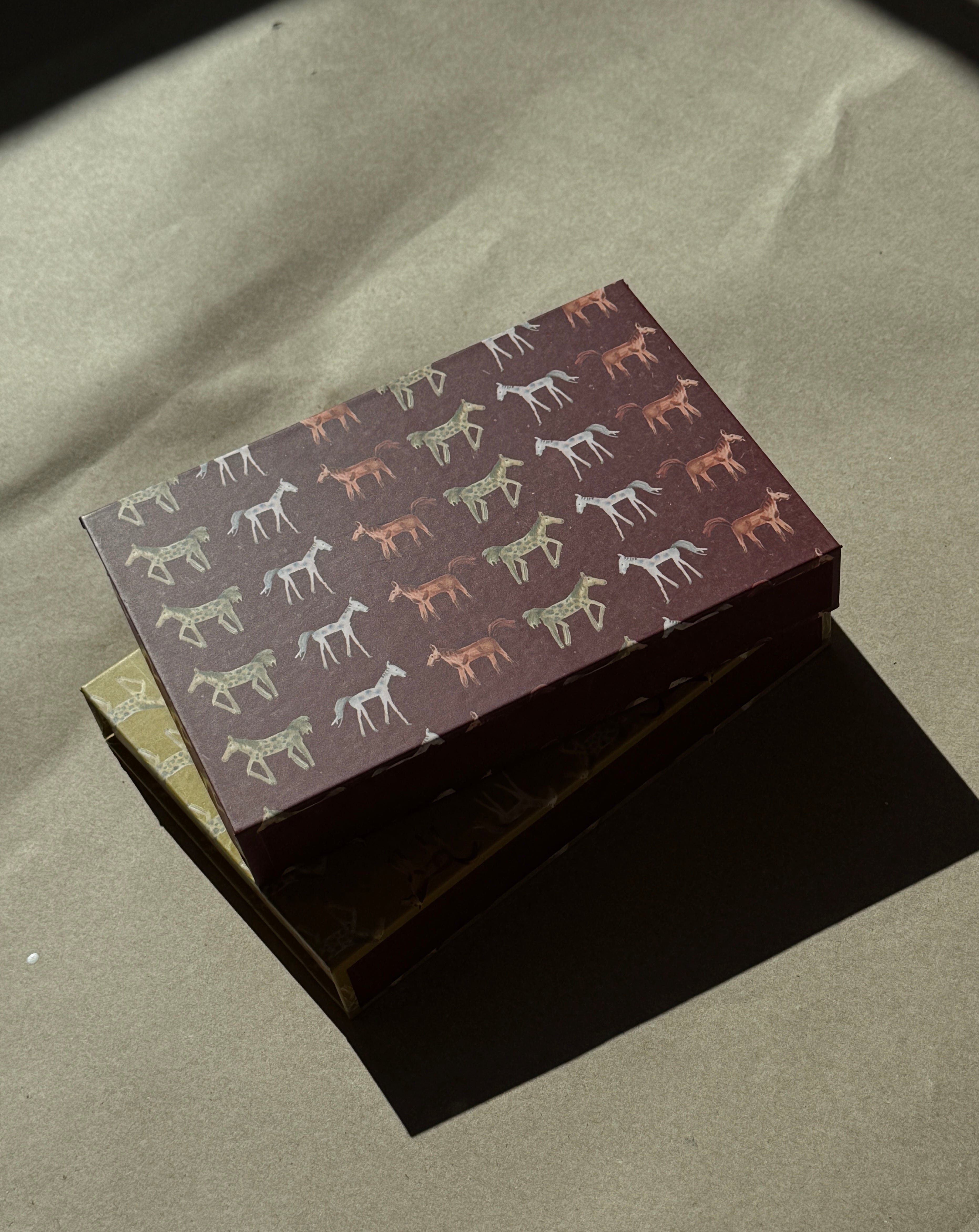 Watercolor horses prance across a rich plum background, bringing warmth, cheer, and a touch of whimsy. We’re especially fond of the playful pony. Deep colors and charming details make this pattern a fresh and delightful way to celebrate the season.